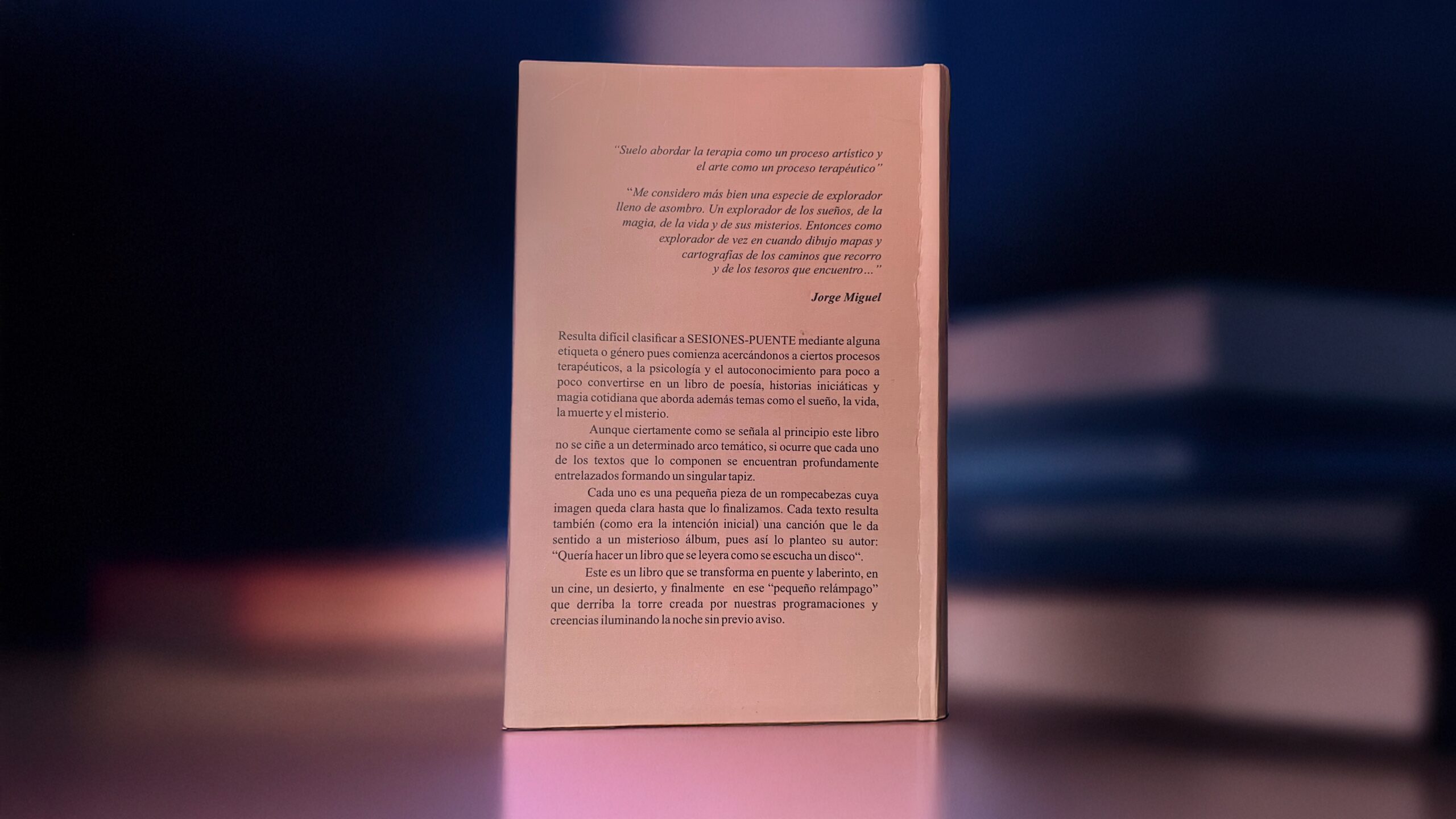 Resulta difícil clasificar a SESIONES-PUENTE mediante alguna etiqueta o genero pues comienza acercándonos a ciertos procesos terapéuticos, a la psicología y el autoconocimiento para poco a poco convertirse en un libro de poesía, historias iniciáticas y magia cotidiana que aborda además temas como el sueño, la vida, la muerte v el misterio.